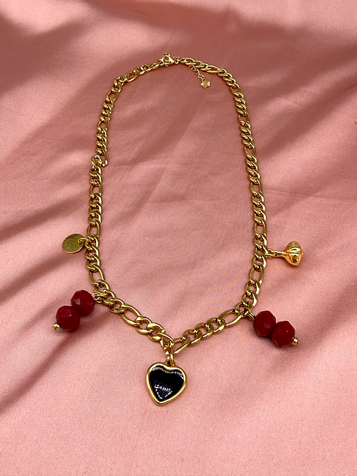 * κολιέ με ατσάλινη αλυσίδα και στοιχεία από ατσάλι , κρυστάλλινες χάντρες και ορείχαλκο.